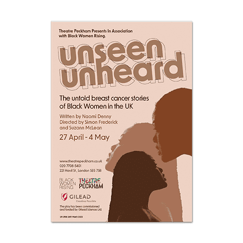 Black women diagnosed with breast cancer (bc) have been found to have poorer survival than White women. Pioneering charity Black Women Rising identified that Black women feel UNSEEN and UNHEARD when compared to White women facing the same life-changing cancer diagnosis, and Gilead Sciences committed their support in helping to change this. Together with Mearns & Pike and Theatre Peckham, they set out to ignite a conversation about cancer inequalities that would bring about action, through the creation of a beautiful, powerful and disruptive play for theatre.